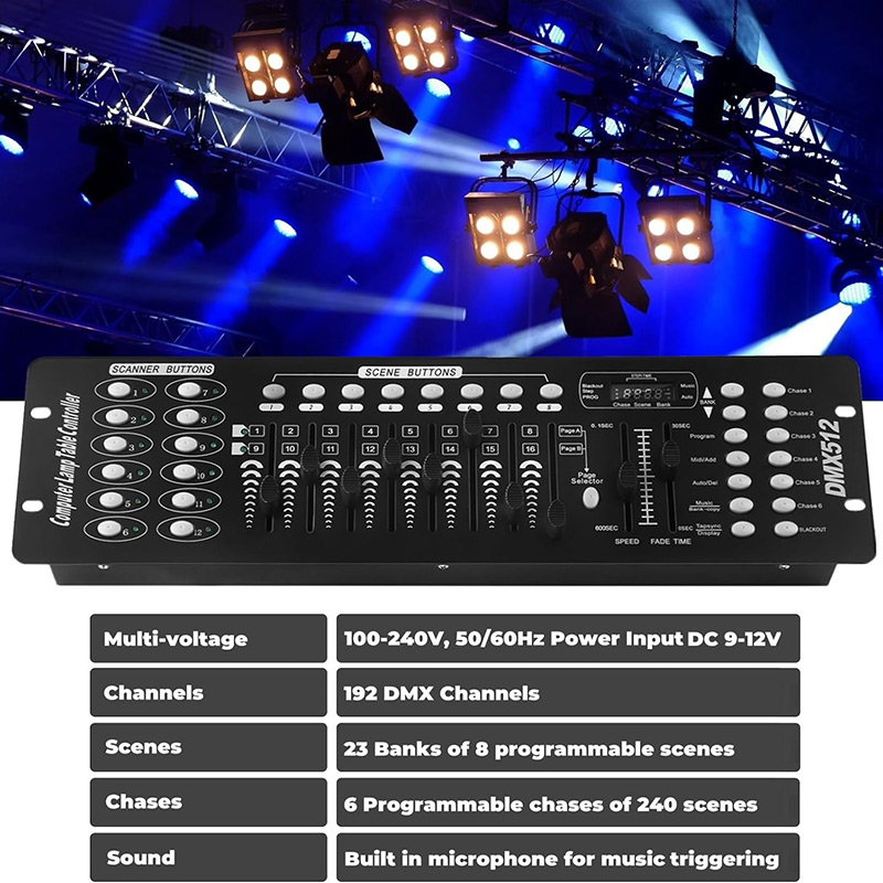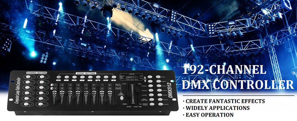 1) This 192 controller is a standard universal DMX 512 controller, controlling up to 192 DMX channels. 2) The lighting control console introduces a new paradigm in programming and operation of lighting shows. 3) It is specially designed to control multiple light effects at once effortlessly. 4) This is the perfect balance among cost, ease of use and remarkable features. It is perfect for those who really want to take advantage of their lighting and effects. 5) Great for DJ’s, school concerts