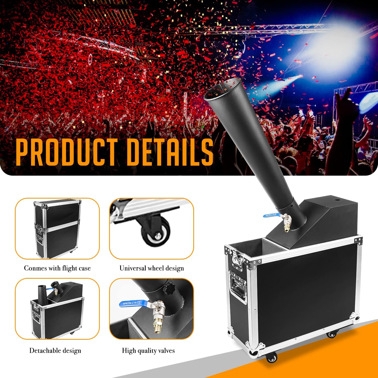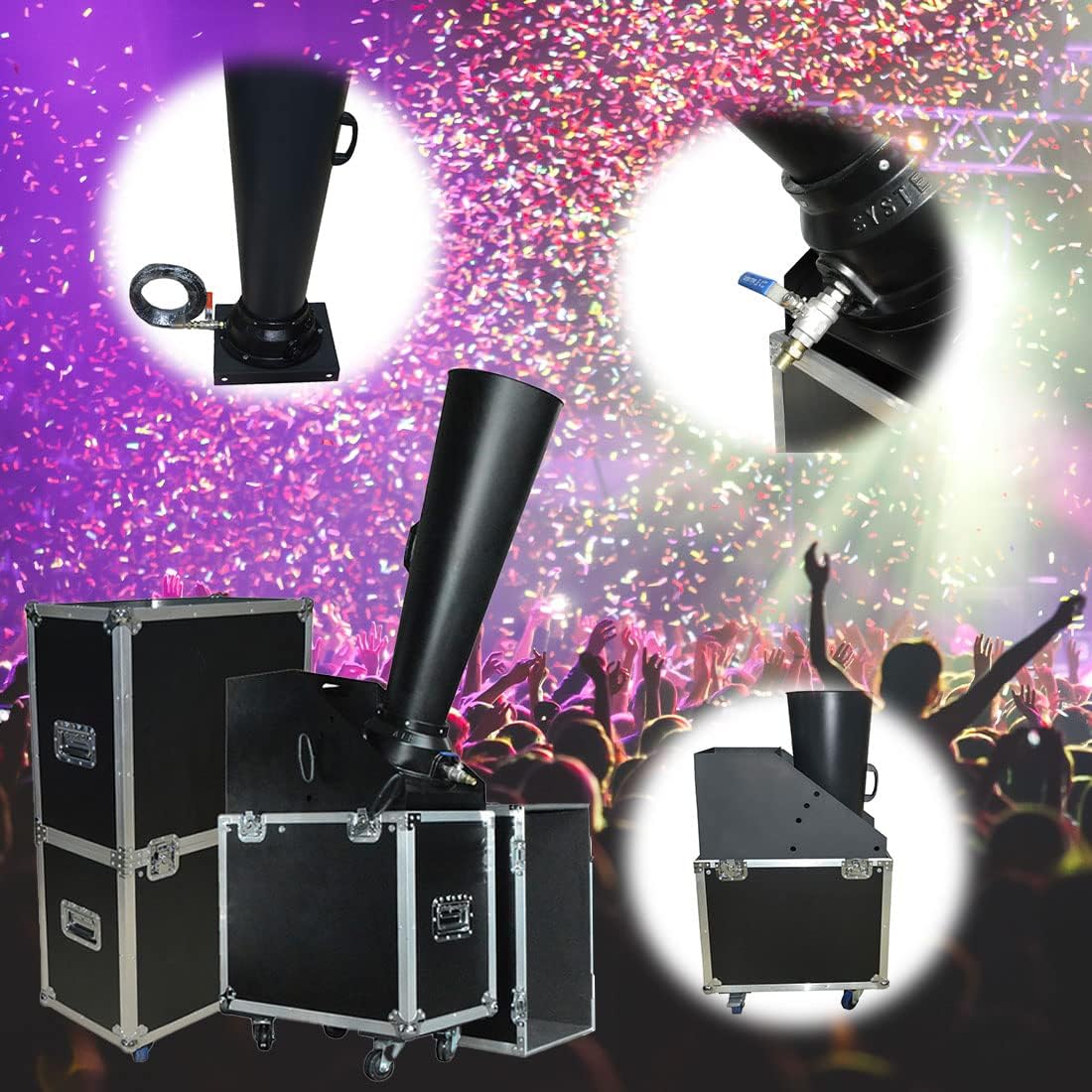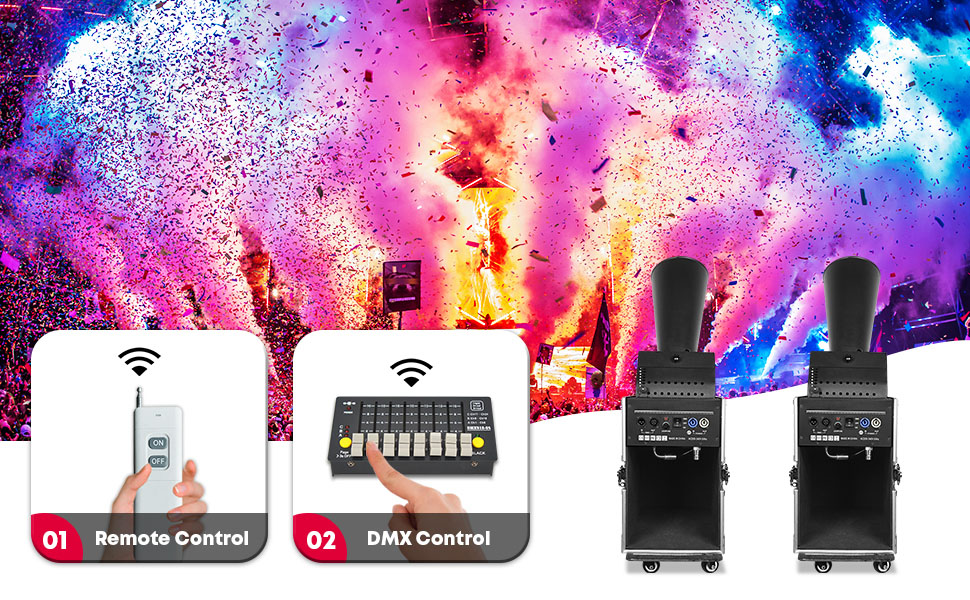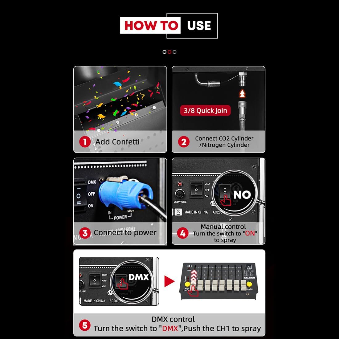 Operate Instruction: 1.Please choose the CO2 gas as power gas. 2.Use high pressure connects tube shall machine with bottle to link. 3.Open the machine box put in confetti paper 1-1.5KG. 4.Please first open the CO2 bottle air pressure,then open the machine valve switch,this time confetti machine can instantaneous jet plentiful confetti paper 5.Caution:Keep a certain distance away from the machine while it is operating.Do not touch any part inside the machine. Do not look into the funnel.Make sure the machine doesn’t do any harm to personnel.Voltage: AC 110V/220V 60/50Hz Power: 1500W Control Mode: DMX/Remote LED:12pcs x3W Shipping Weight:14Kg/1pcs Continuous Output: 20s-30s Spray Height: 4-5m Size: 57 x 33 x 33cm