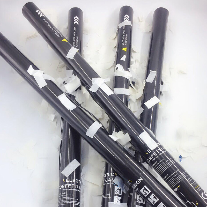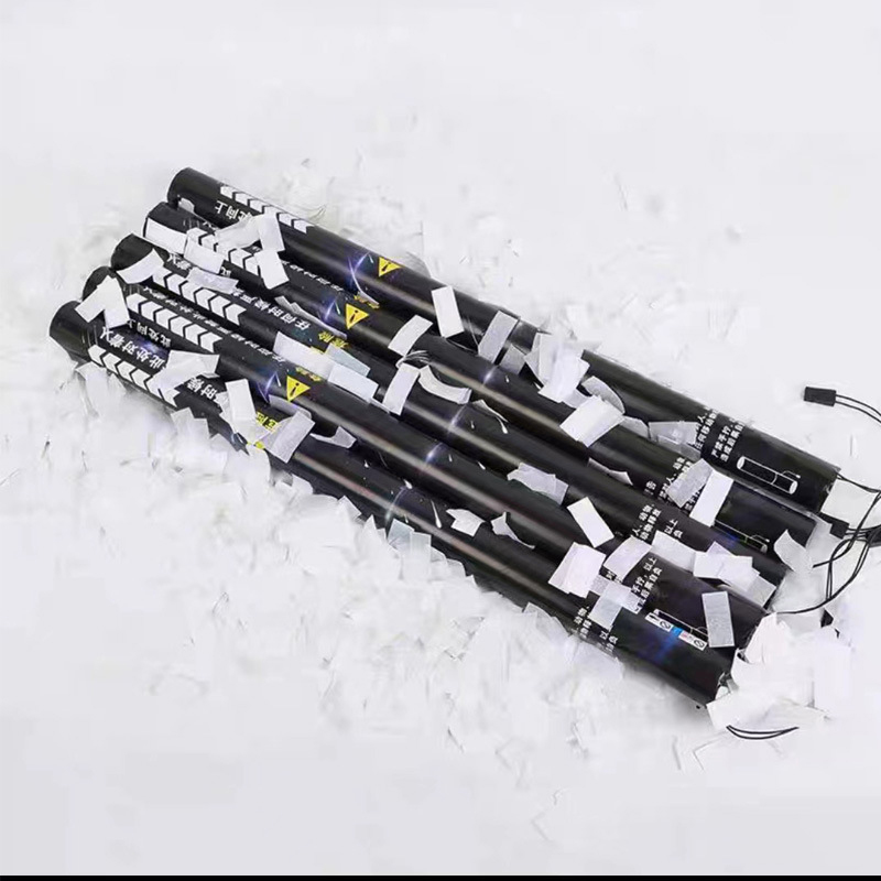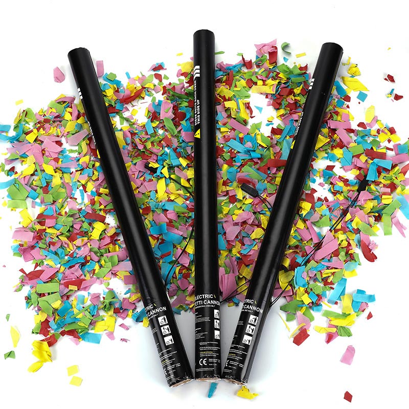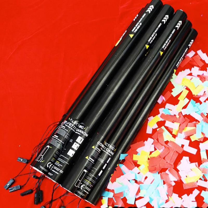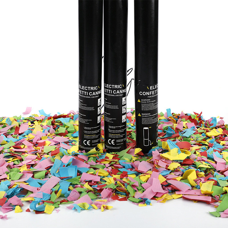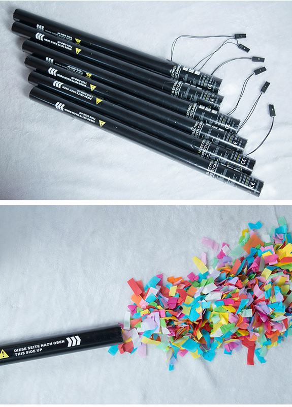 ● The confetti cannon is a single use cannon, prefilled with confetti. Need to be used with Confetti machine. ● 5x 80cm Confetti cannon. ● Consumption: Confetti. ● E-Cartridge is recommended for most indoor or outdoor jobs with ceiling clearance of 15'. Confetti will give the best coverage while streamers give more distance. For low ceiling shots, confetti is best. ● Cost effective, safe and easy to use. Comes ready to shoot right out of the box. (machine required) Nitrogen filled so no danger of fire. Streamer & Turbofetti contents all flameproof.
