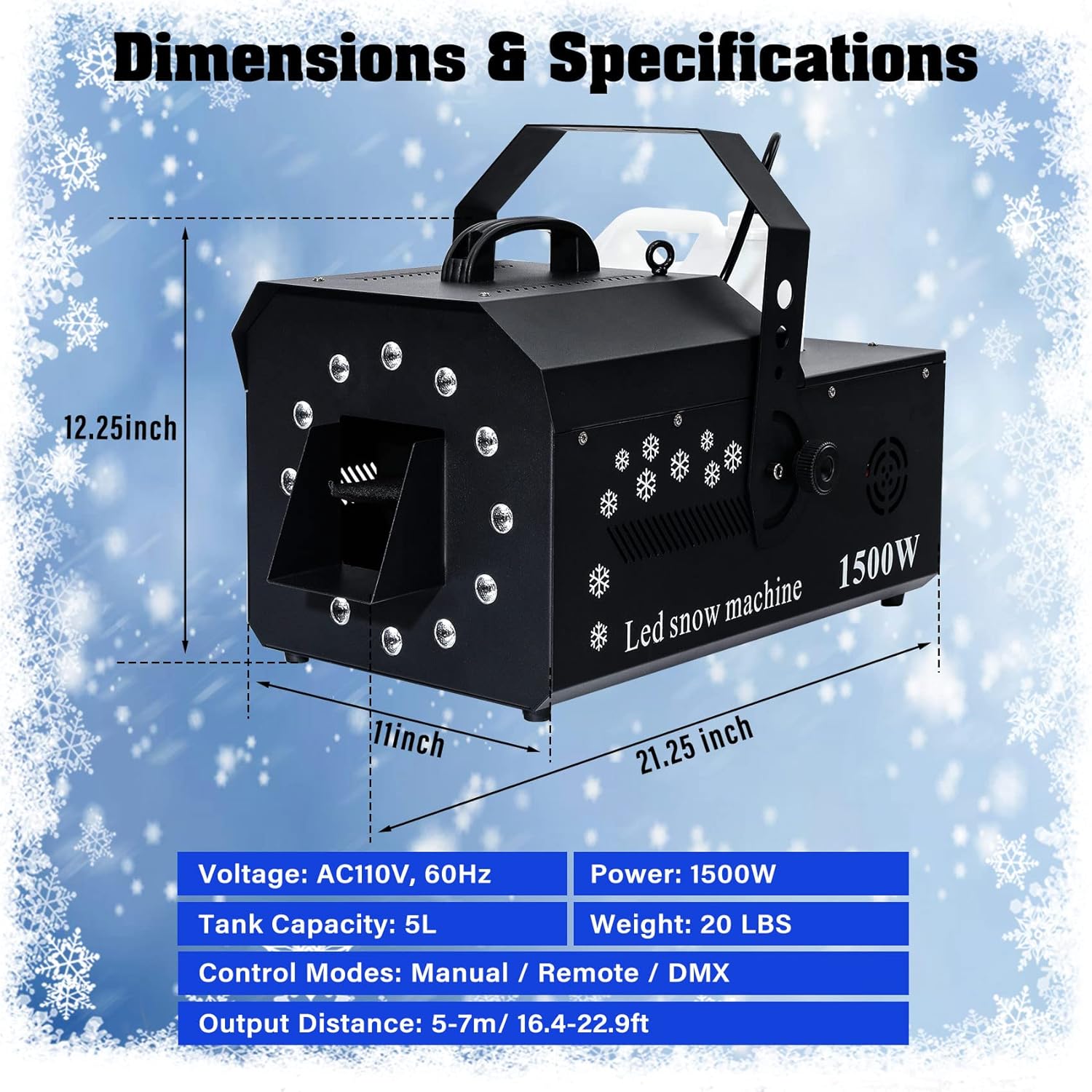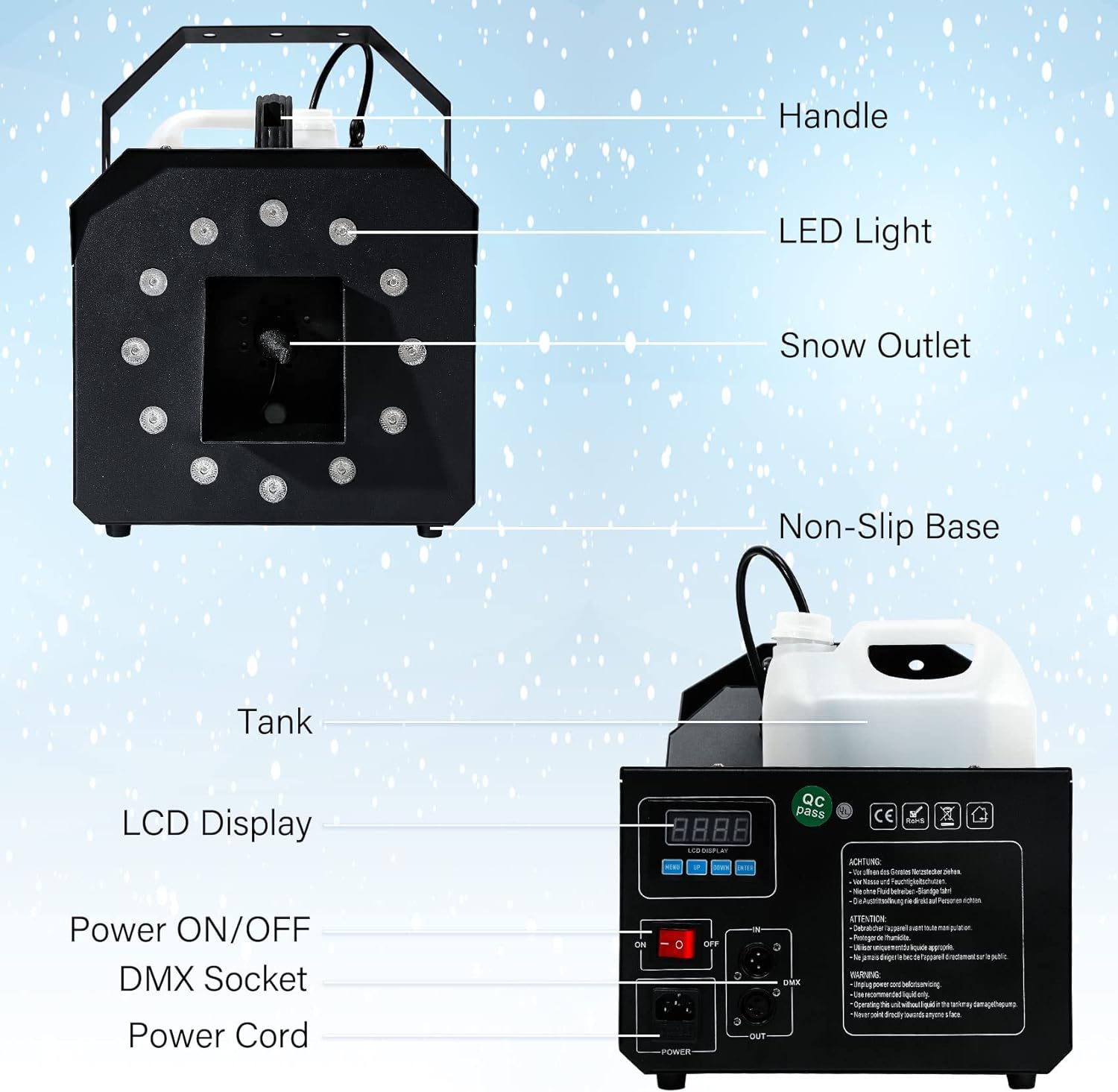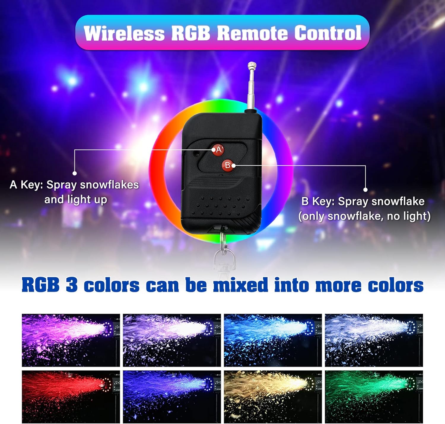 Wireless Remote: 1. Press “A” Key To Spray Snowflakes And Light Up (LED walking) 2. Press “B” To Spray Snowflake (Only Snowflake, No Light) DMX channels: 1. Snowflake Spray (Snowflake Adjustable) 2. Snowflake Spray (Working At Full Capacity) 3. R-LED 4. G-LED 5. B-LED 6. Fast and slow flash (brightness is controlled by R, G and B) 7. LED three-segment functional mode: (10 - 99)The gradient、(100 - 199)jump、(200 - 255)Pulse variable. 8. Led Multifunction Mode Speed.Voltage: AC 110V / 60Hz Tank Capacity: 5 L Control: Manual / Remote / DMX Product size: 55x30x30cm/21.65x11.81x11.81in Package Included: 1x Snowflake Machine 1x Wireless Remote 1× Power Wire Plug