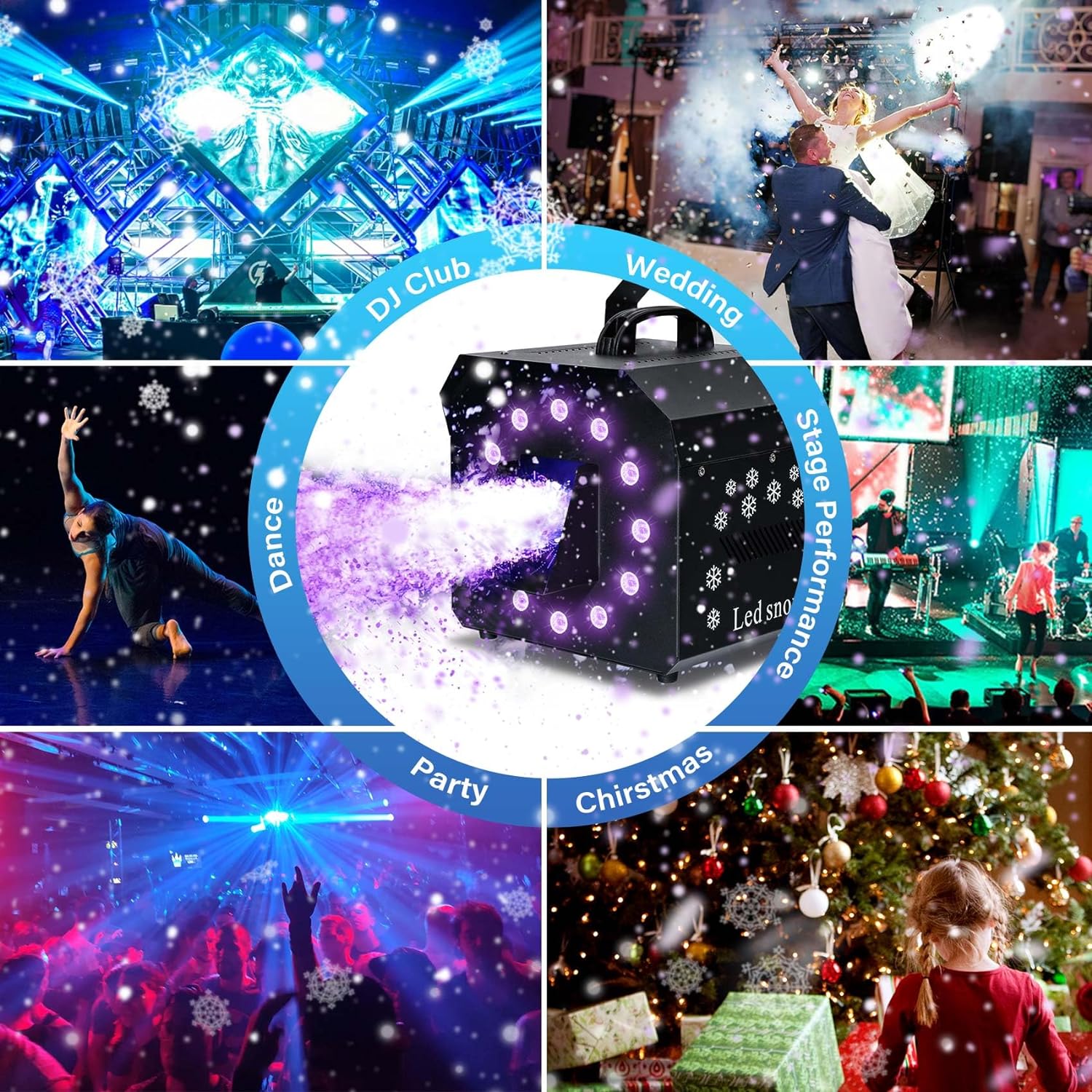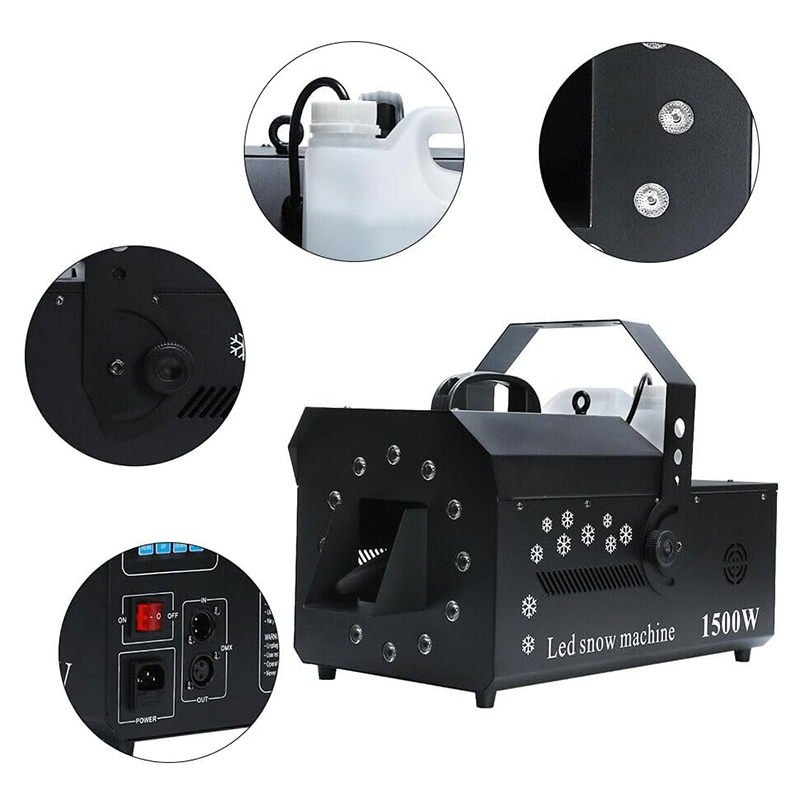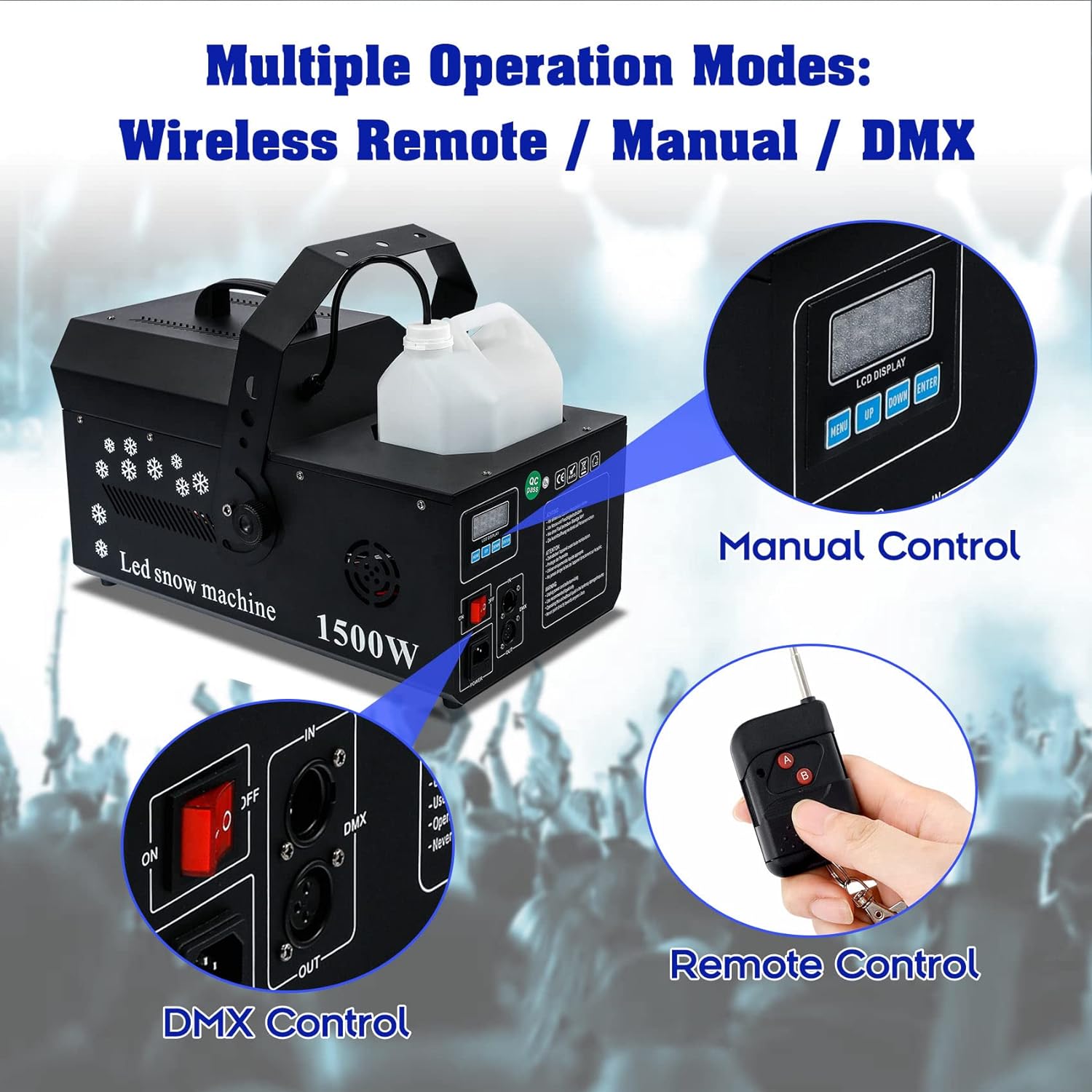Wireless Remote: 1. Press “A” Key To Spray Snowflakes And Light Up (LED walking) 2. Press “B” To Spray Snowflake (Only Snowflake, No Light) DMX channels: 1. Snowflake Spray (Snowflake Adjustable) 2. Snowflake Spray (Working At Full Capacity) 3. R-LED 4. G-LED 5. B-LED 6. Fast and slow flash (brightness is controlled by R, G and B) 7. LED three-segment functional mode: (10 - 99)The gradient、(100 - 199)jump、(200 - 255)Pulse variable. 8. Led Multifunction Mode Speed.Voltage: AC 110V / 60Hz Tank Capacity: 5 L Control: Manual / Remote / DMX Product size: 55x30x30cm/21.65x11.81x11.81in Package Included: 1x Snowflake Machine 1x Wireless Remote 1× Power Wire Plug
