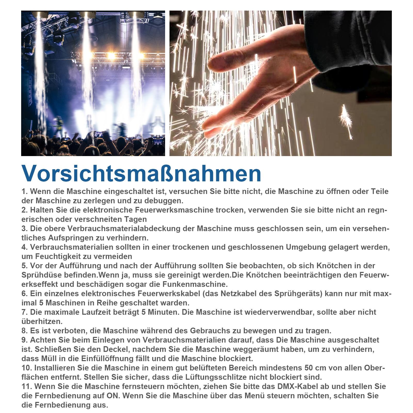 ● 1. This product is safe and environmentally friendly, non-toxic and harmless. ● 2. The sparking is mild and non-invasive, the hand can touch, will not burn clothes. ● 3. Special light machine supplies compound titanium powder need to be purchased separately. ● 4. Each use of the machine after the machine please clean up the residual material in the special effect machine to prevent clogging the machine.