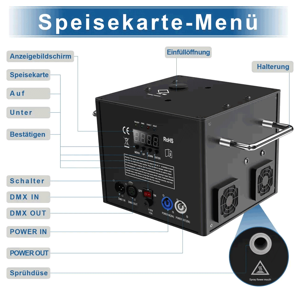 1 x Stage Equipment Special Effect Machine 1 x DMX Signal Cable 1 x Power Line 1 x Remote Control 1 x Fuse 1 x Introduce book| Model Number: | SP1005 |
