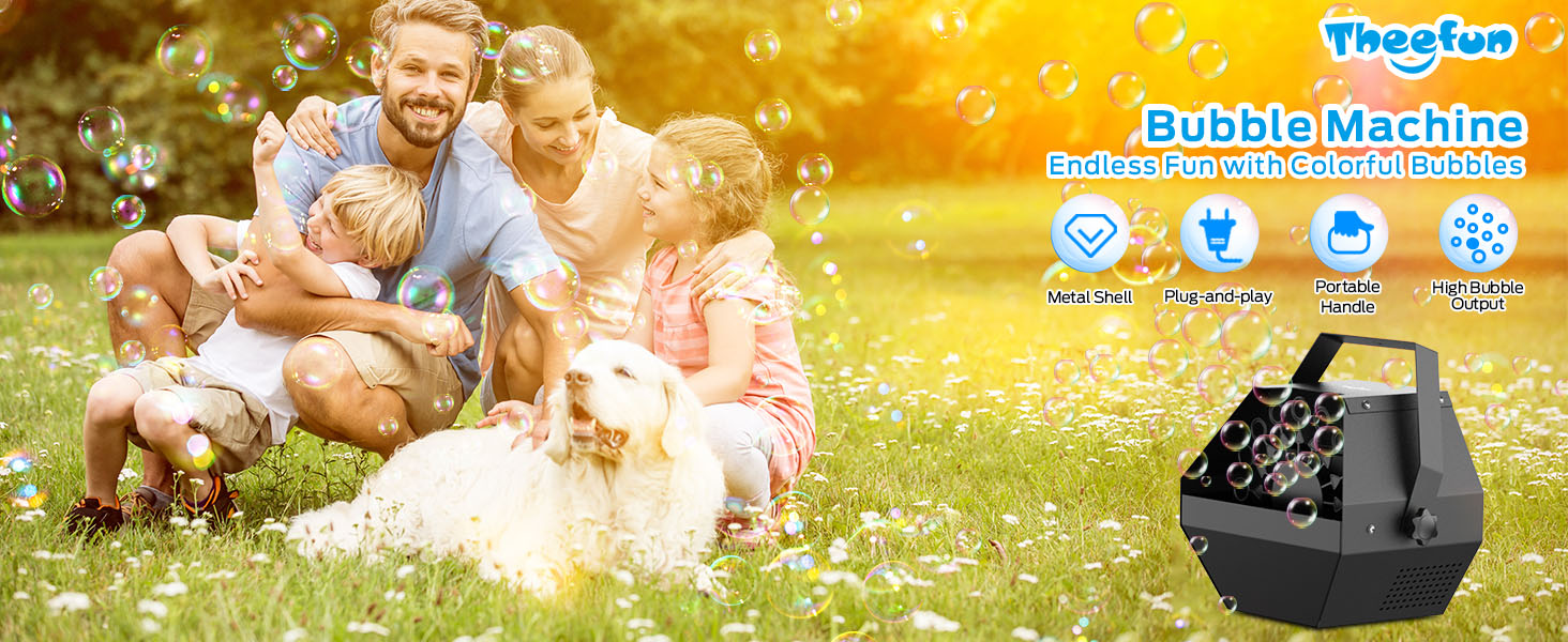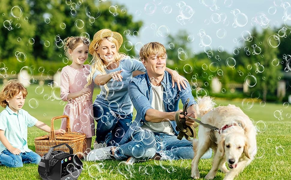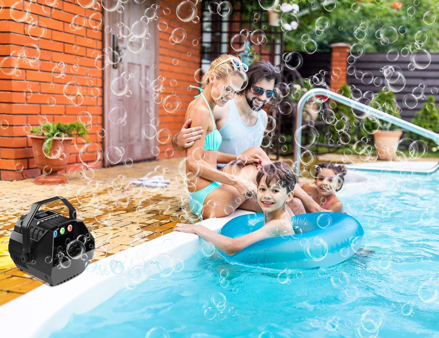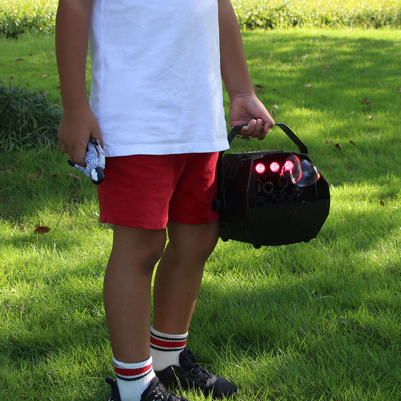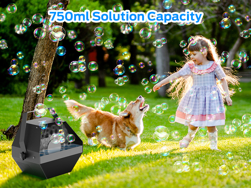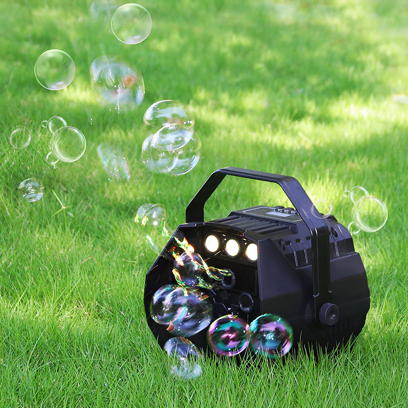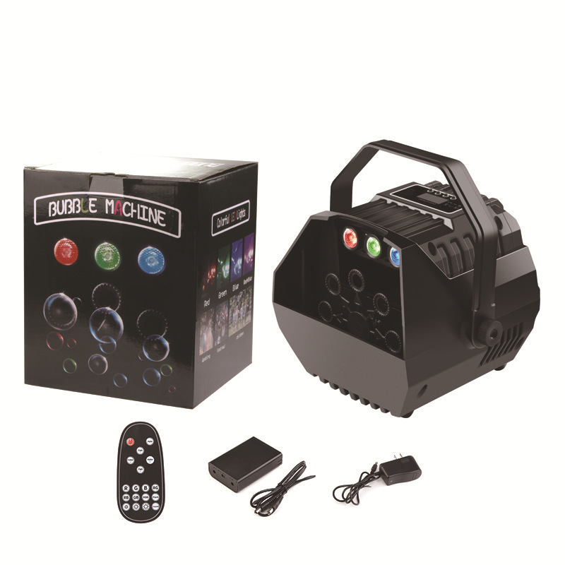 【8000+ COLORFUL BUBBLES & REMOTE CONTROL】Upgraded bubble maker, 8000+ bubbles can be launched per minute with 8 spinning wands, 2 speed level, LED screen operation. 【WONDERFUL LED LIGHTING】Use LED light function when it's dark, kid’s smile face are illuminated with a rainbow of colors. Great for weddings, bubble party, summer pool, BBQ, birthday, Christmas and outdoor garden yard etc. Perfect outdoor toys and great gift for toddlers, kids & pets. 【OFFICIAL CPC TOY SAFETY CERTIFICATION】Made from safe durable ABS material with CE, CPC, FCC, RoHS certifications. Safe and harmless to kids, toddlers, pets and adults. 【LARGE CAPACITY 400ML】12.5oz/400ml capacity and 30mins continuous use, no need to add bubble liquid in several times, enjoy uninterrupted bubbles leisure time!1.Voltage:AC90-240V 50-60HZ; 2.LED Lights Control:Auto/Remote/Sound/Flash; 3.Power Supple:Powered by both plug in or batteries case;1 x Bubble machine 1 x Wireless remote 1 x Battery case 1 x DC adapter 1 x Manual1 x Bubble Machine 2 x Screw 1 x Handle