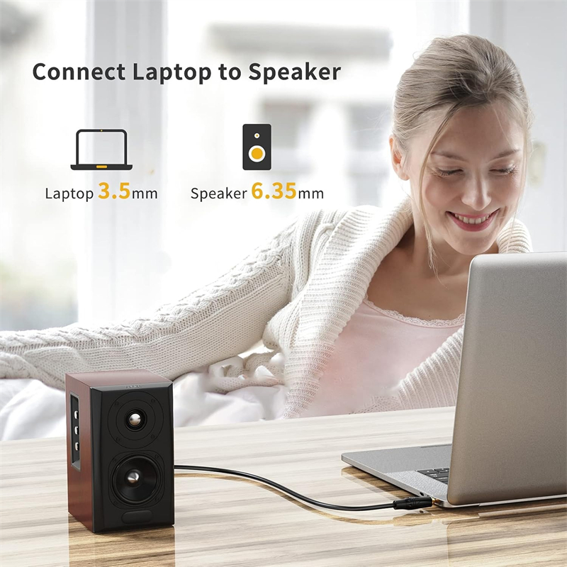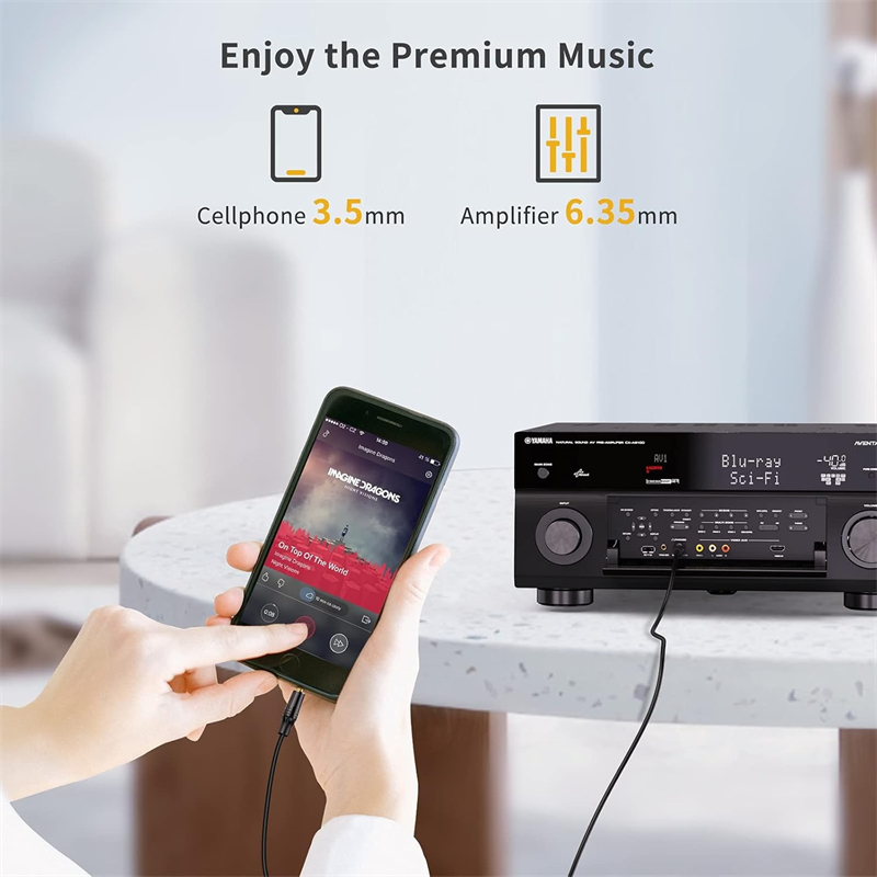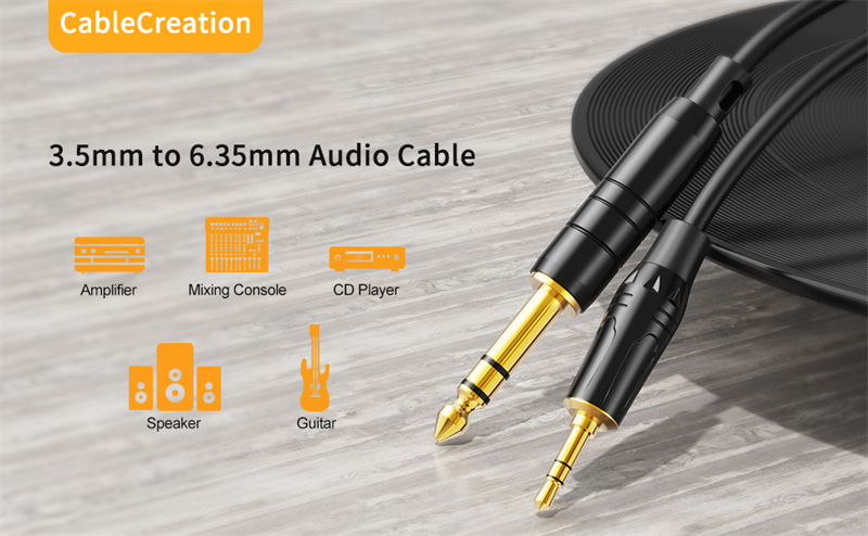 Product Detail:·Super Sound :Pure copper provide maximum's conductivity and durability, 3.5mm to 1/4 cable can transfer high purity audio signal.·Astonishing Sound Quality: 24K gold plated connector ensure 3.5 mm to 1/4 optimal signal transfer and corrosion resistance.·Durable Quality:1/8 to 1/4 stereo cable with Soft PVC jacket, strong and durable, good thick, but flexible.·Compatible Devices: 3.5mm to 6.35mm cable Ideal for connecting between devices with 3.5mm 1/8" and 6.35 1/4" port. You can connect your iPod, laptop with 3.5mm jack input to a mixing console, home theater devices, and amplifiers with 6.35mm output.3.5mm 1/8" Male Stereo to 6.35mm 1/4" Male TRS Stereo Audio Cable connects Smartphone, iPod, MP3, Speaker, Microphone, Amplifier and so on.24K Gold Plated Connector24k gold plated connectors which protect the cables from corrosion. Not worry about the connectors loose issue.Lightweight & Easy to CarryCovered with soft PVC jacket which effectively prevent wire knotting. And it makes the cable lightweight & easy to carry.Double ShieldedFoil shielded and metal braided shield make the sound quality undisturbed by external signals