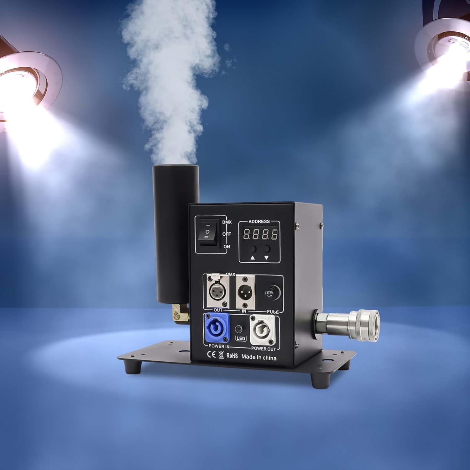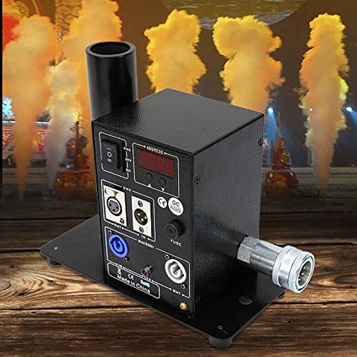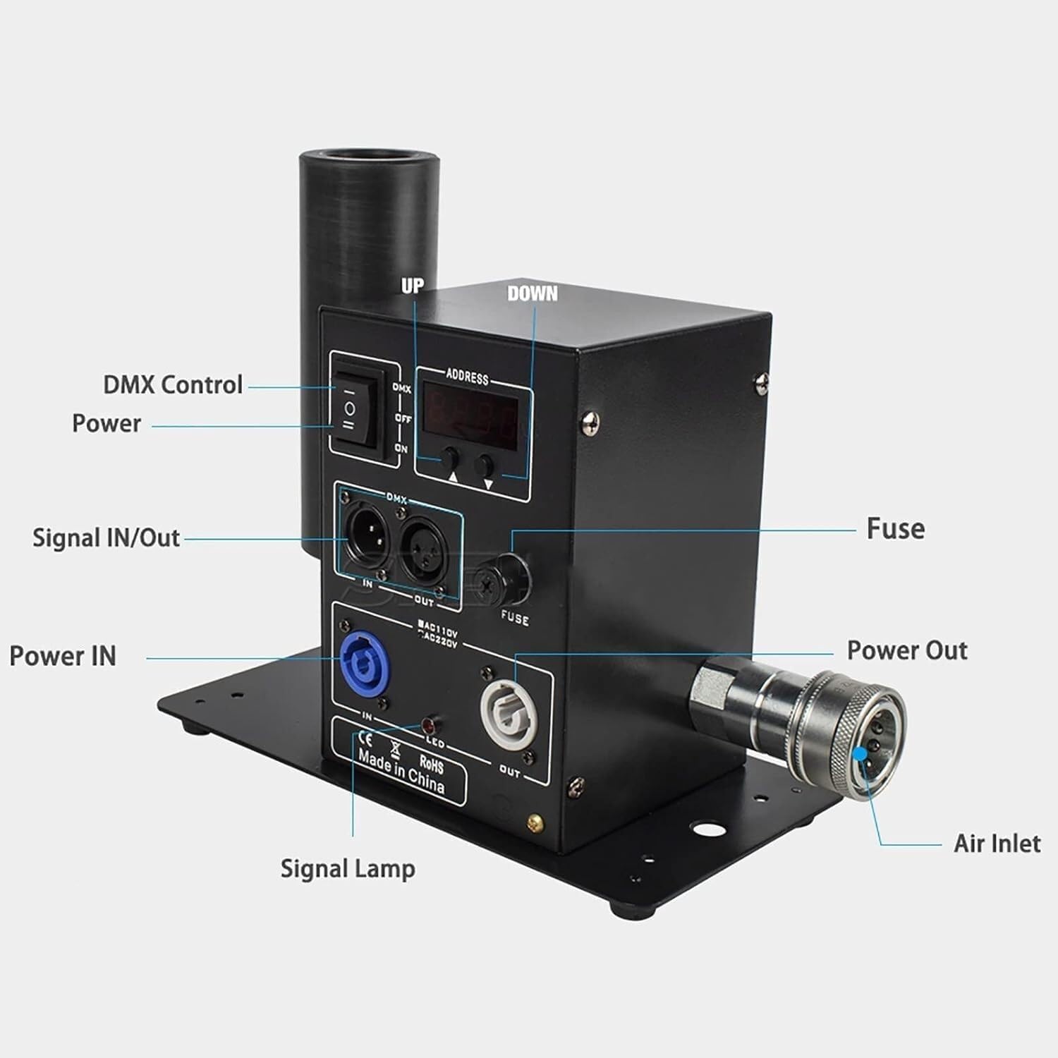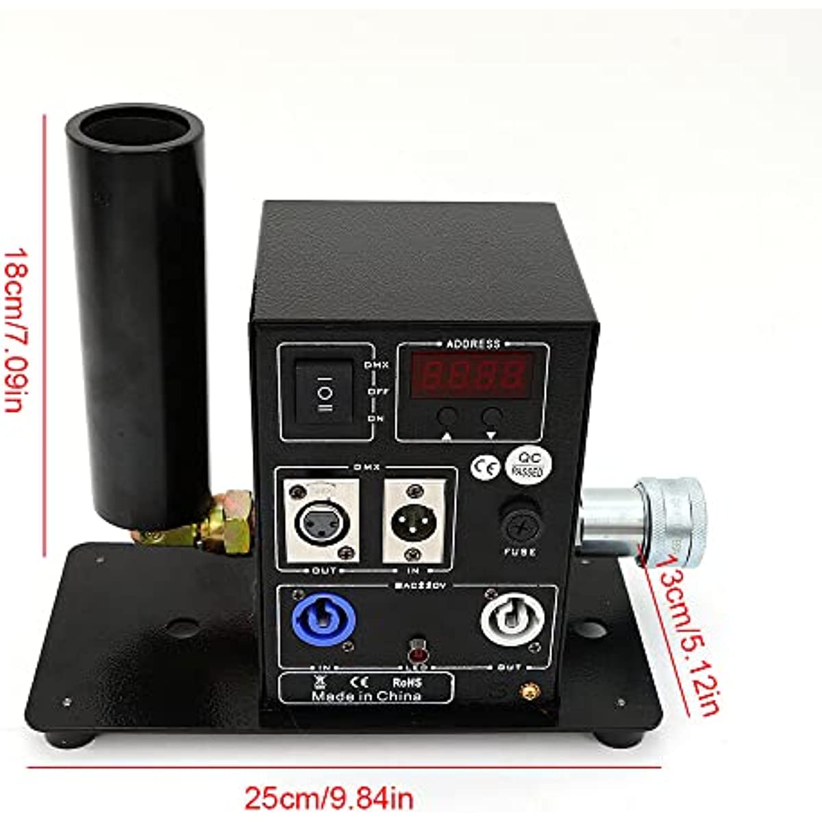 Power: 150W Control: DMX 512 Spray Height: 8-10 Meters Voltage: Ac 110v-220V, 50-60hz Unidirectional Power SupplyWeight: 9.9 Lbs (4.5 Kg) Carton Size: 30*28*28 Cm Product Size: 25*13*18 Cm(9.84*5.12*7.09In)1.This Co2 Jet Device Can Create Amazing Effects By Ejecting a 8-10m High White Gas Column. 2.It Is Suitable For Big Concerts, Fashion Shows And Night Clubs.