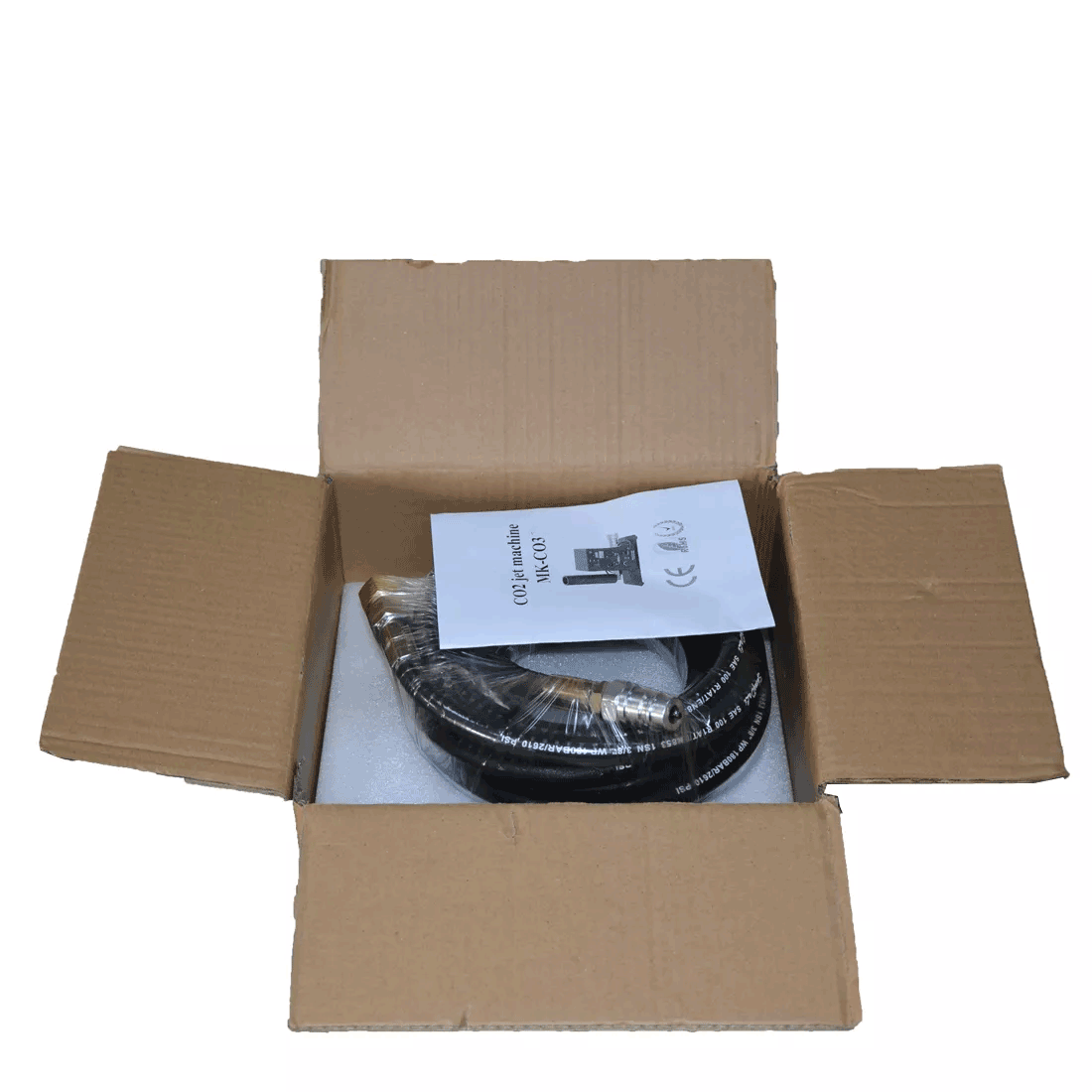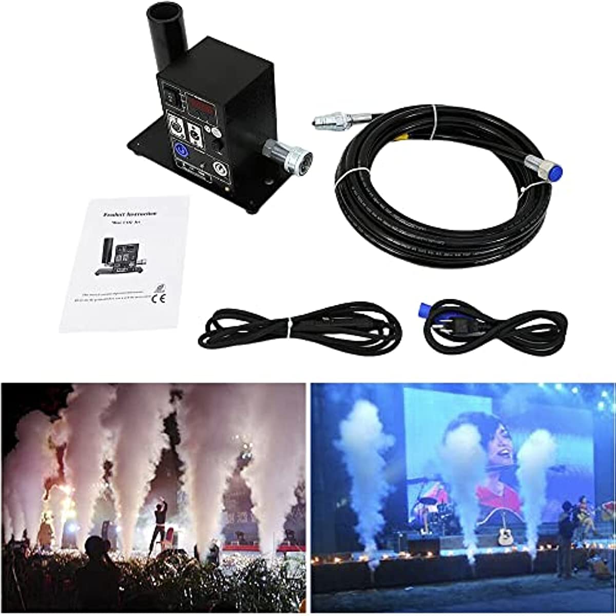 1* Co2 Jet 1* Signal Line 1* Hose About 16 ft(5 meters) 1* Power Line 1* Manual1. Places the large CO2 column on the corresponding position 2. Connect the co2 hose to gas bottle 3. Put down the bottle and keep it flat 4. Connect the machine with the gas bottle via the hose, hose one side connect with tank, the other side connect with the machine 5. Turn on the valve of the gas bottle 6. Connect the machine and the console. 7. Before disassembling, firstly turn off the bottle valve, let out the gas which remain in the pipe, then turn off the power, lastly separate the connector of the gas bottle.