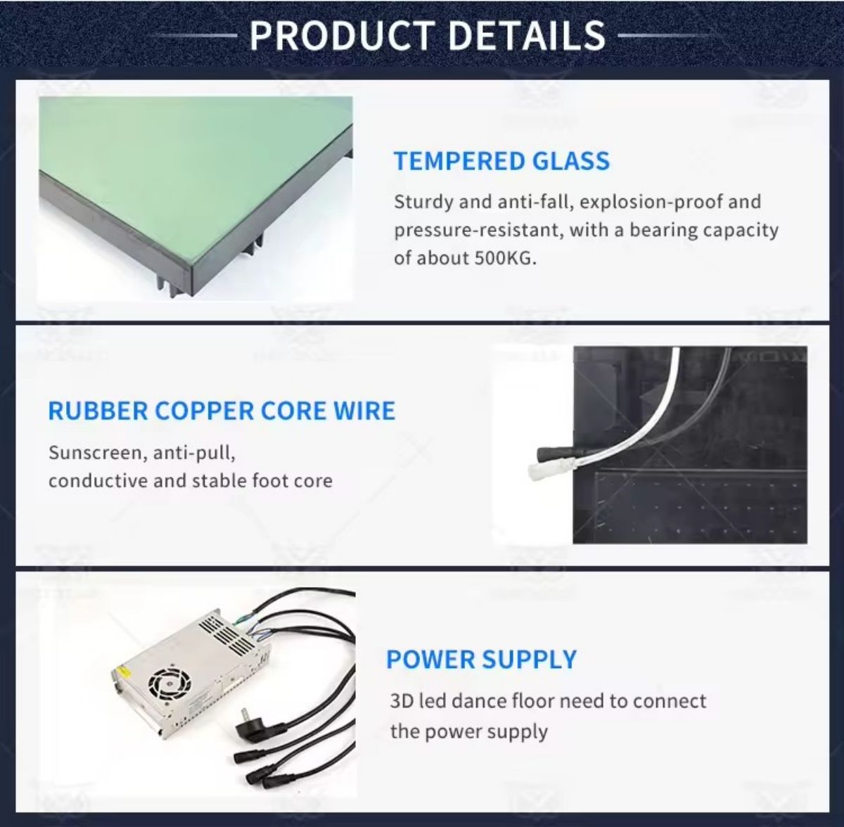 | 1pc power supply can supporting 10pcs dance floor | |