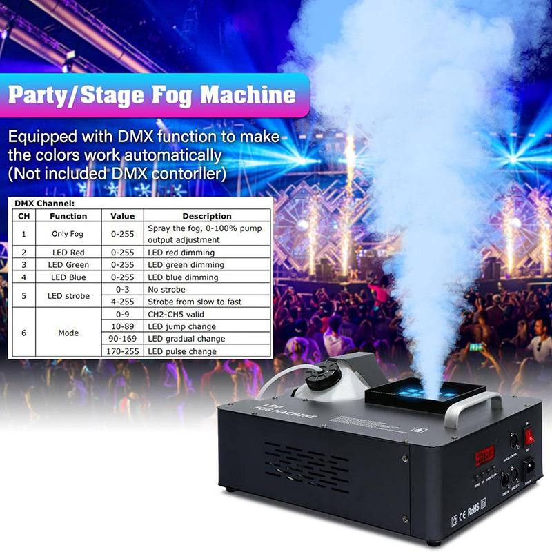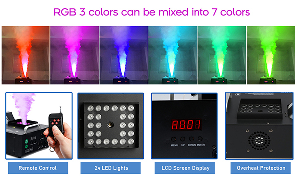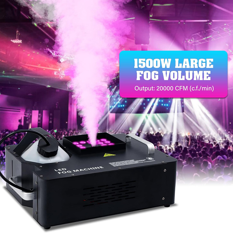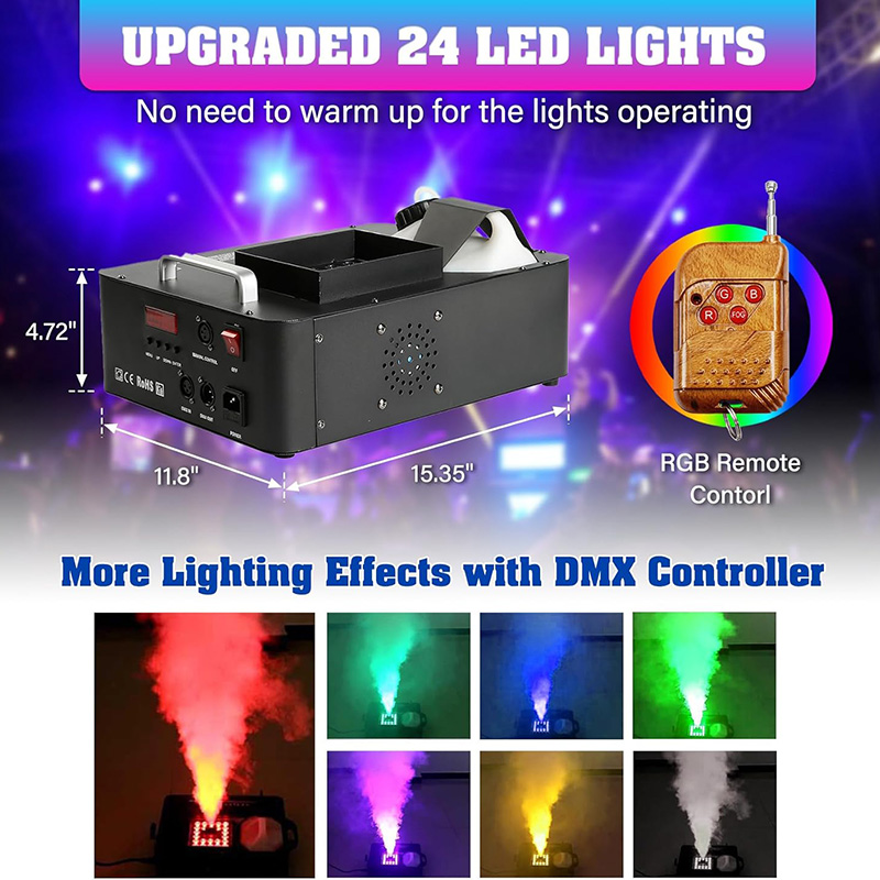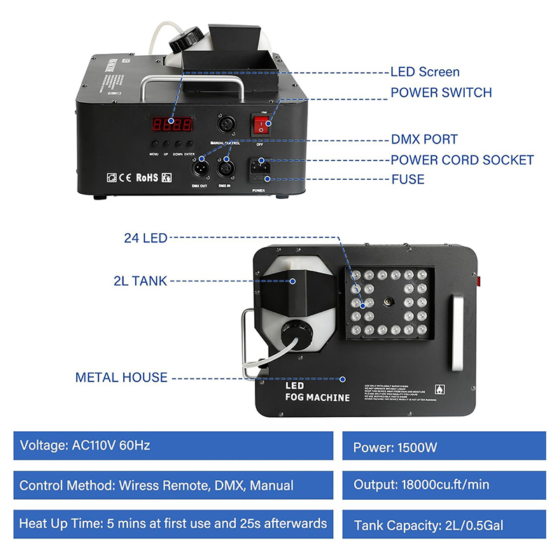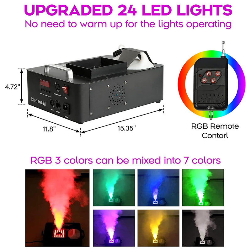 【Up/Down Vertical Spray Fog Machine】Voltage: AC110V-240V 50Hz/60Hz. Power: 1500W. Output: 18000 CFM (c.f./min). Output distance: 8m/26ft. Tank capacity: 2.5L/84oz for long lasting fog production. Spraying direction: up / down, take the metal plate off, and turn the fuel tank around, you can make the fogger to spray downward. 【Upgrated 24 LED Lights RGB】 Fog machine is equipped with 24 stage LED Lights to combine the fog. Equipped with RGB remote control, you can press a button anytime, anywhere to make the machine spray and choose your preferred light color. It is perfect for Halloween, party, wedding, stage performance, hoilday, dancing, club, etc.