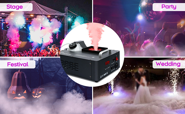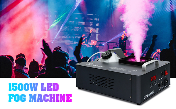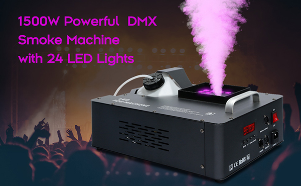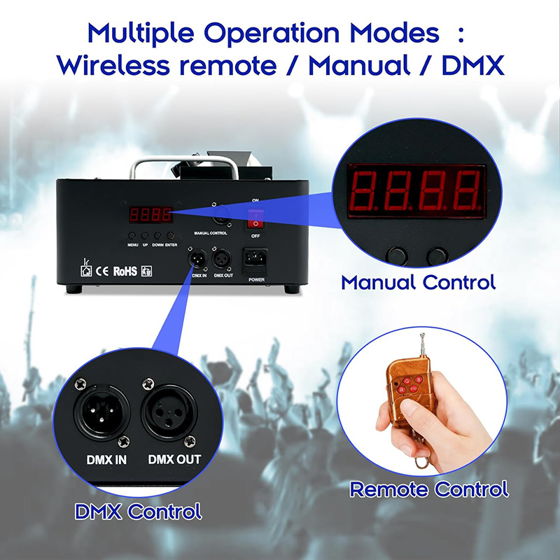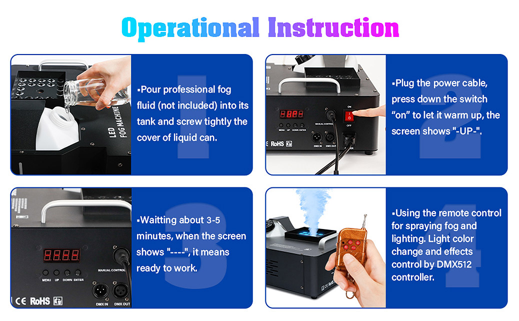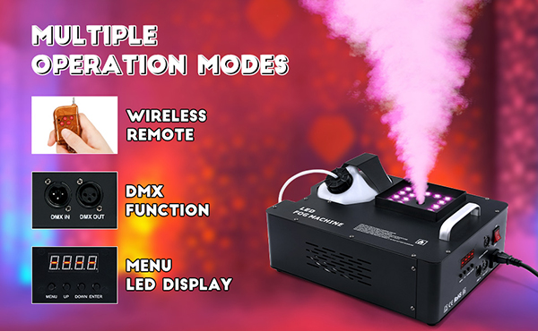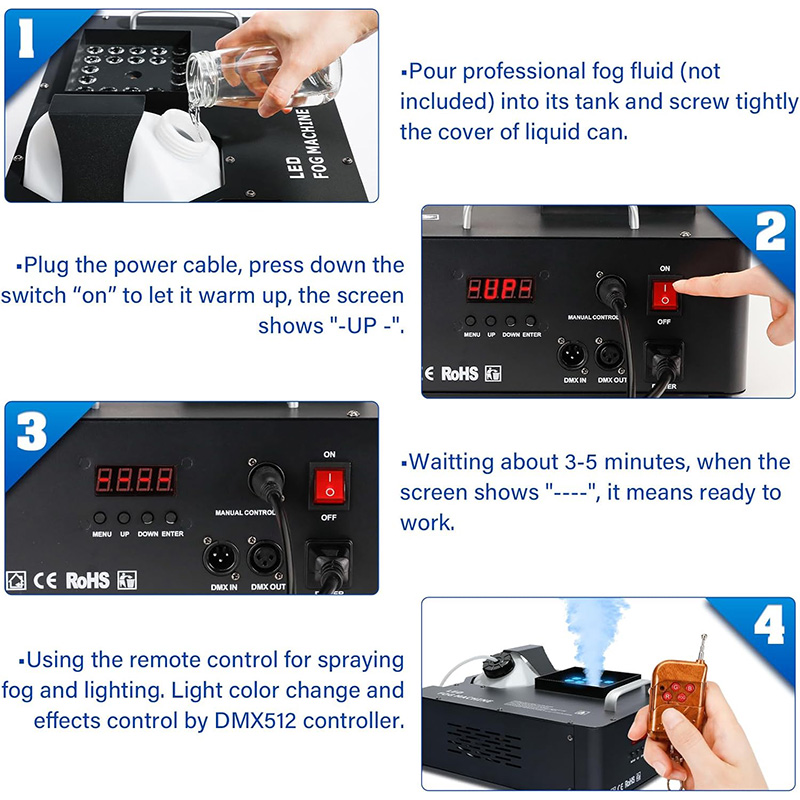 【Up/Down Vertical Spray Fog Machine】Voltage: AC110V-240V 50Hz/60Hz. Power: 1500W. Output: 18000 CFM (c.f./min). Output distance: 8m/26ft. Tank capacity: 2.5L/84oz for long lasting fog production. Spraying direction: up / down, take the metal plate off, and turn the fuel tank around, you can make the fogger to spray downward. 【Upgrated 24 LED Lights RGB】 Fog machine is equipped with 24 stage LED Lights to combine the fog. Equipped with RGB remote control, you can press a button anytime, anywhere to make the machine spray and choose your preferred light color. It is perfect for Halloween, party, wedding, stage performance, hoilday, dancing, club, etc.
