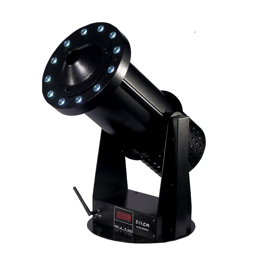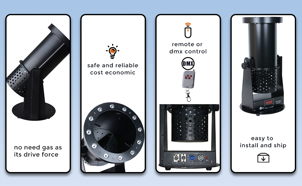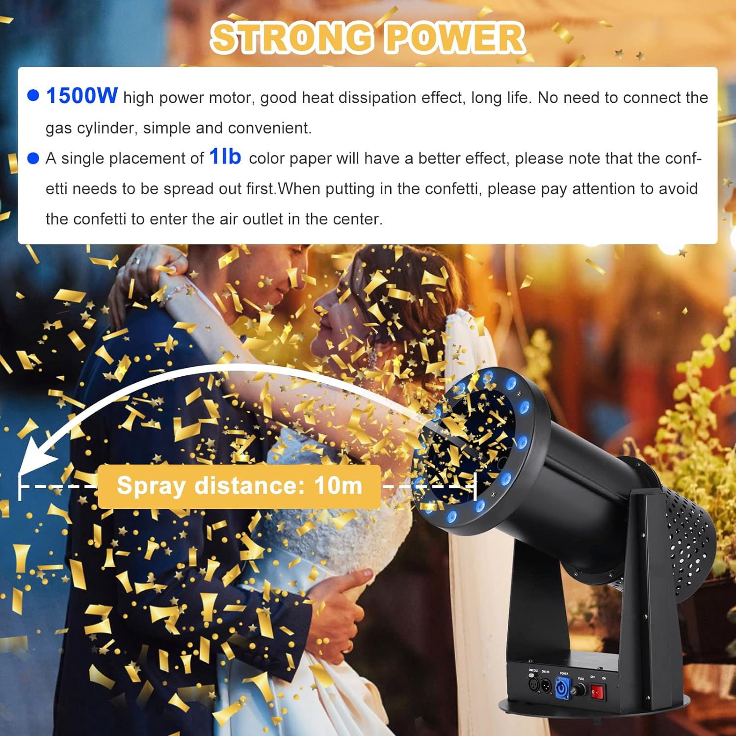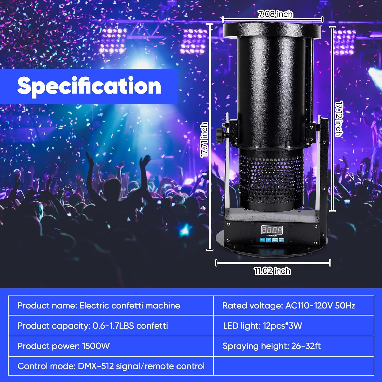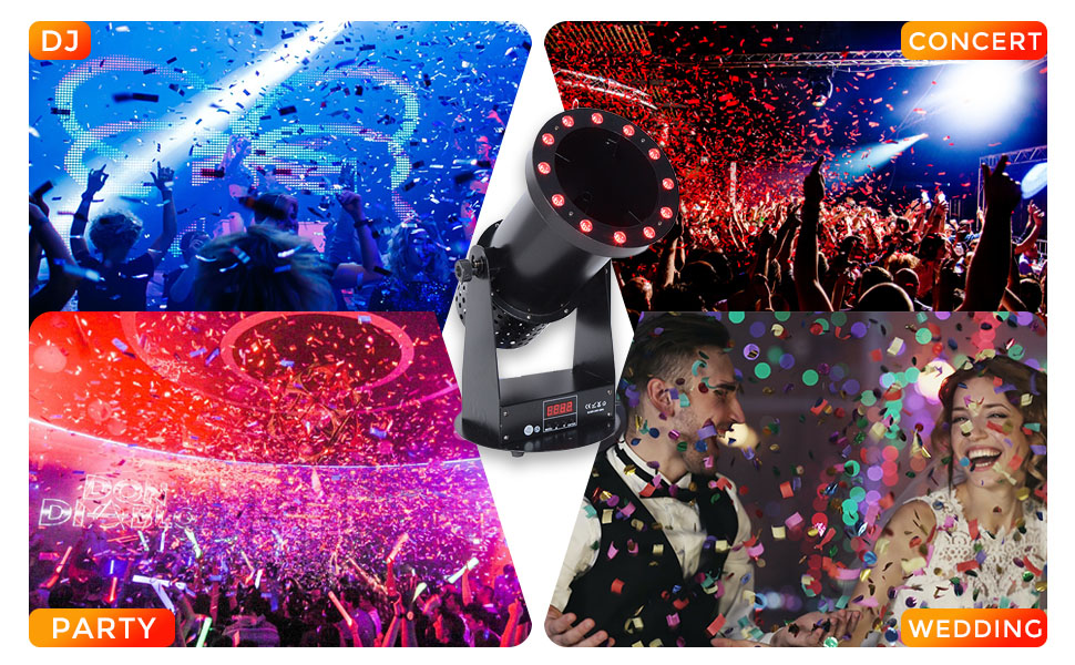This confetti machine equipped with 12X3W RGB single color led lamps around the cannon head, It is a compact confetti machine but powerful, can shot big amount of confetti into sky in a instant, a confetti fountain will show immediately, no need gas as its drive force, safe and reliable, cost economic, easy to install and ship, remote or dmx controlVoltage: AC 110V/220V 60/50Hz Power: 1500W Control Mode: DMX/Remote LED:12pcs x3W Shipping Weight:14Kg/1pcs Continuous Output: 20s-30s Spray Height: 4-5m Size: 57 x 33 x 33cm