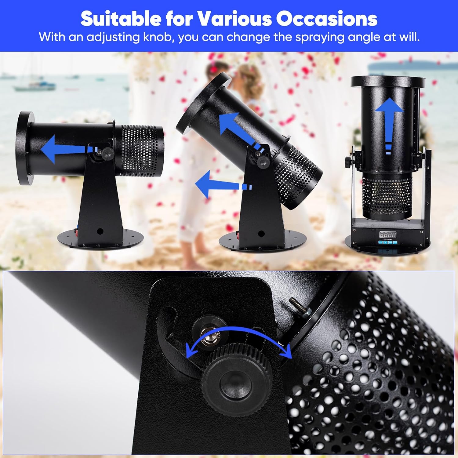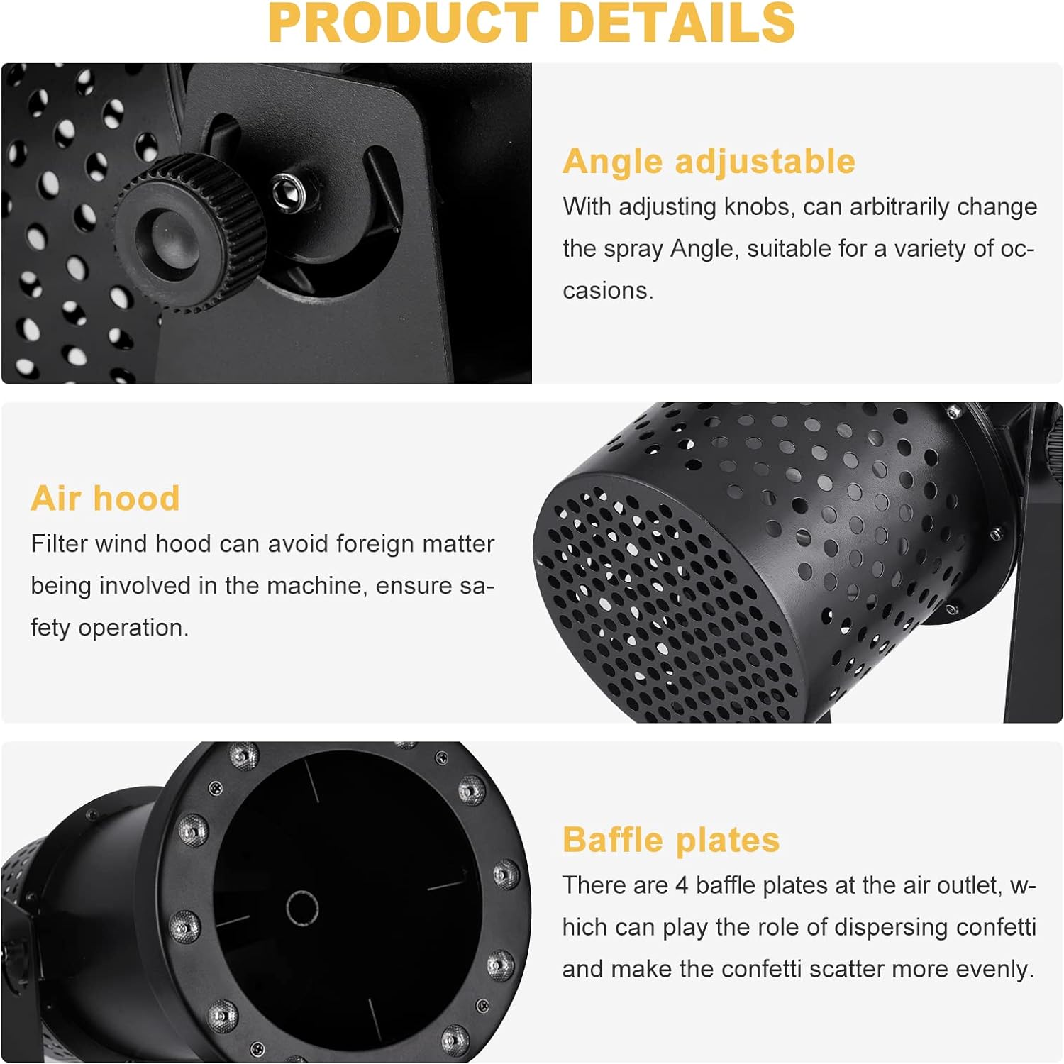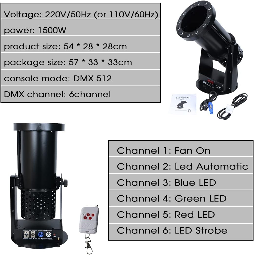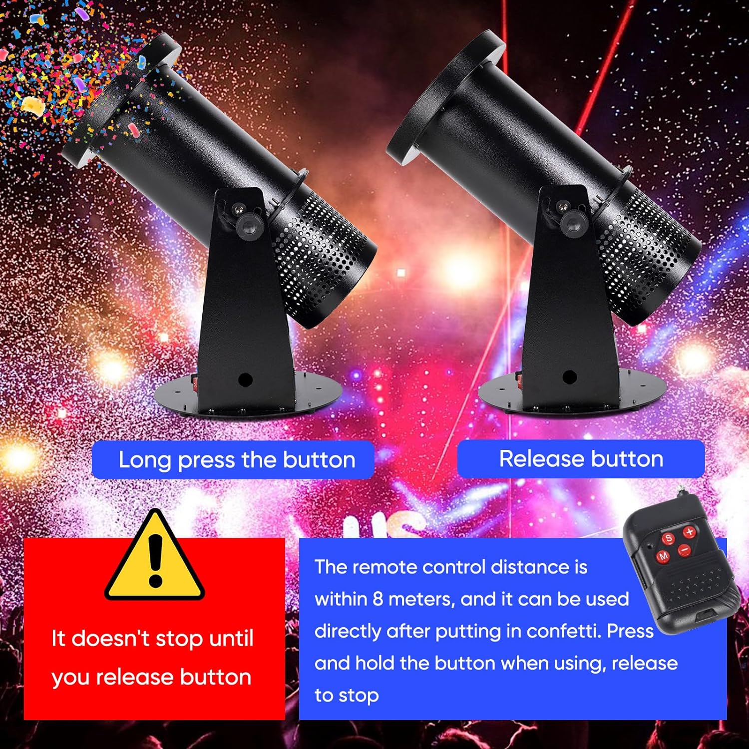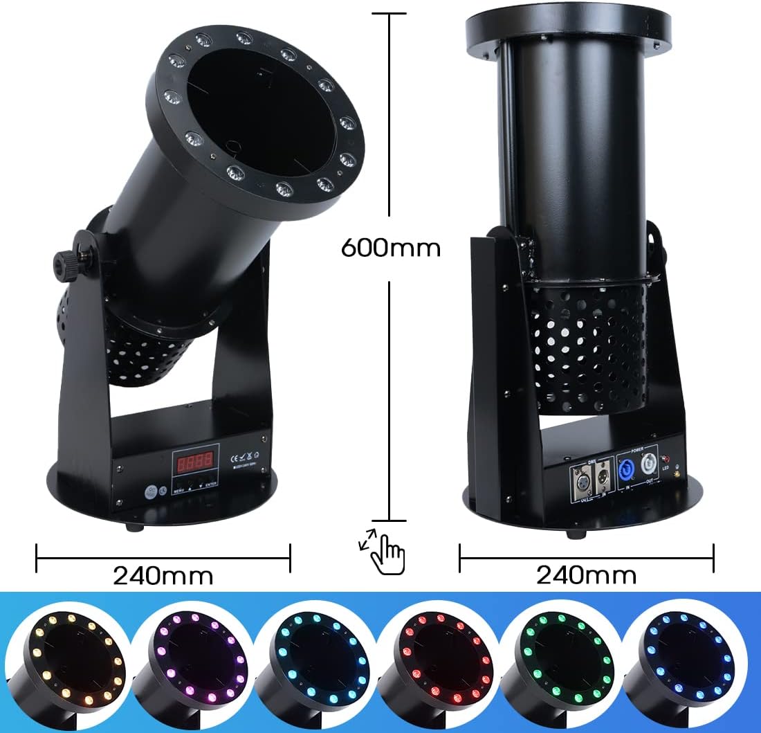 This confetti machine equipped with 12X3W RGB single color led lamps around the cannon head, It is a compact confetti machine but powerful, can shot big amount of confetti into sky in a instant, a confetti fountain will show immediately, no need gas as its drive force, safe and reliable, cost economic, easy to install and ship, remote or dmx controlVoltage: AC 110V/220V 60/50Hz Power: 1500W Control Mode: DMX/Remote LED:12pcs x3W Shipping Weight:14Kg/1pcs Continuous Output: 20s-30s Spray Height: 4-5m Size: 57 x 33 x 33cm