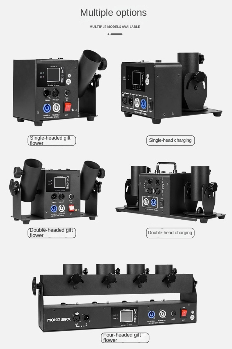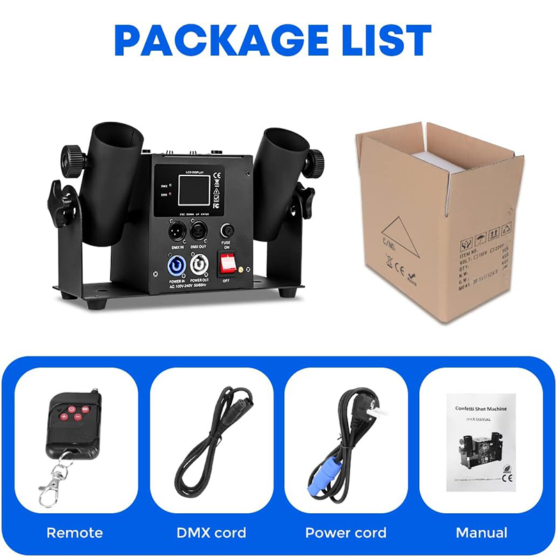 This confetti machine can use colored ribbon or colored paper, it is recommended to use colored ribbon, and the colored ribbon is sprayed at a high point. Color paper spray 6-10 meters, ribbon spray 8-12 meters. First, insert the inflation tube into the air compressor, stop inflation when the pressure gauge shows 15-20kg (1.5-2Mpa), Then put the confetti paper into the aluminum tube, turn on the power and turn on the remote control to launch. Put about 0.1-0.2kg confetti paper at a time, put about 24 pieces of 2cm*5m colored ribbons The machine can be controlled by remote control.Spray height:6-12 meters Voltage:AC110V -220V, 60Hz /50Hz Max Power:60W Control:DMX 512/Remote DMX Channel:4