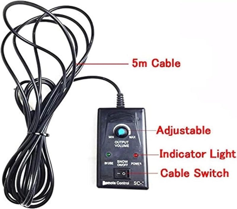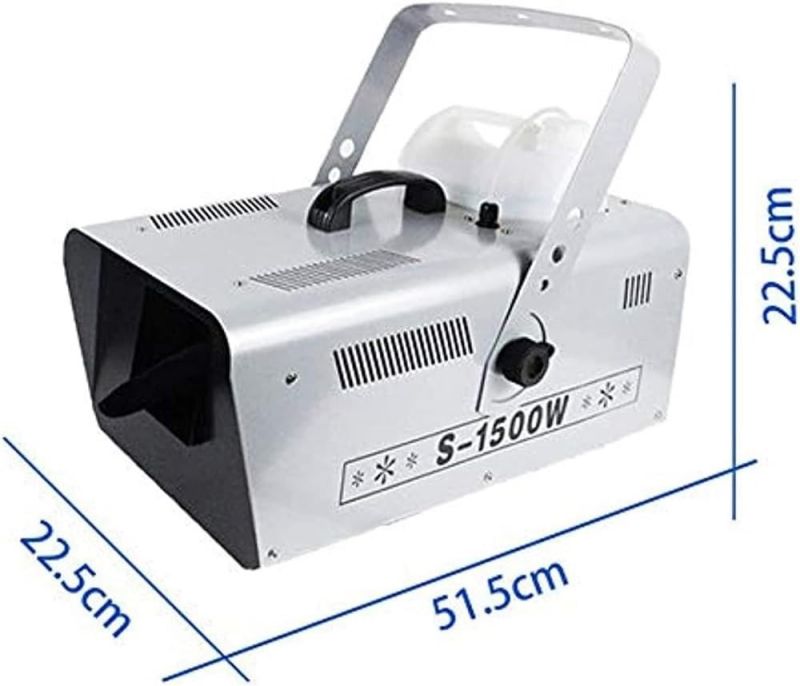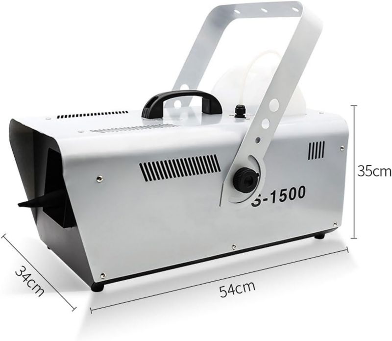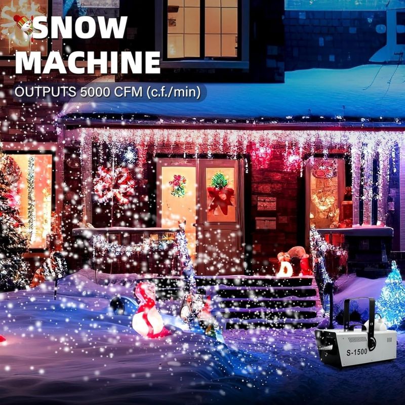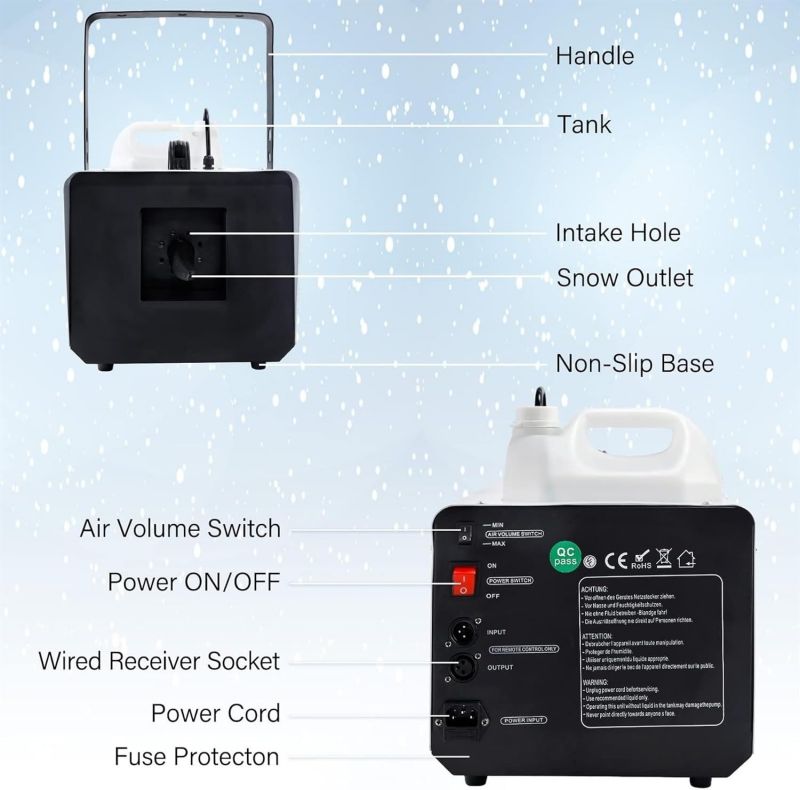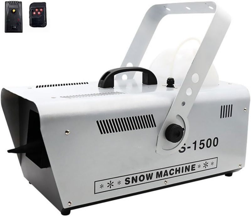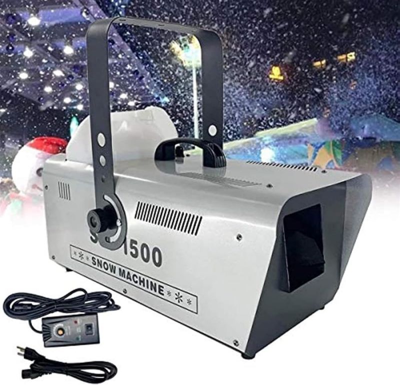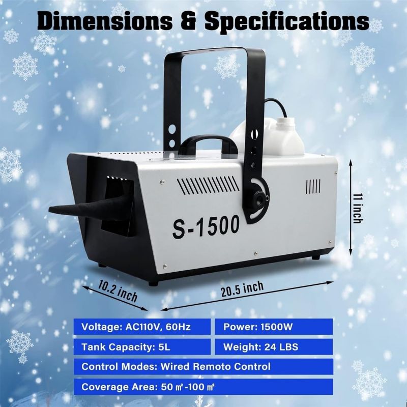 ● [Snow Machine for Indoor & OutdoorSnow] machine is used to make snowflake effect for indoor and outdoor, it can create a romantic snow scene for all year round. 1500W Large output snow machine that produces abundant amounts of snow that are capable of blowing considerable distances, output distance 6m/19.98ft.● [Easy to Use]You just need to pour snow fluid (not included), turn on the snow machine, use the wired remote control for spray out snow flakes. It is more convenient to use, great for creating an exciting visual effect for Christmas, weddings or party, stage performance, DJ club, dance halls, discos, etc.● [Air Volume Switch]Our snowflake machine is also equipped with an air volume switch (back of machine), so you can adjust the snow according to your needs. You will get an amazing snow party with your famiy and friends.● [Safe & Large Capacity Snowflake Machine You can use the snow snowflake machine for artificial snow with confidence because it does not produce any toxic gas. Comes with 5L/170oz tank for long lasting snow production, it must be turned off before the liquid is used up to ensure safety.● [Durable and Portable Snow Machine]The snow machine is equipped with handle to make it easy to carry, light enough but durable in use. Built from aluminum and iron for better heat dissipation, ensure durability and long lifespan. Hanging bracket comes standard for ease of trussing and installation.Specification:Large amount of snowflakes, adjustable sizeCan be controlled remotely, convenient and trouble-freeReinforced handle, portable and comfortableHigh-quality cooling system to protect the normal operation of the internal systemLarge-capacity fuel tank, longer spraying snow, larger spraying areaName: 1500W snow making machineVoltage: 110V~240V, 50/60HZPower: 1500WNet weight: 7KGSize: 39x53x110cmControl mode: manual/remote controlJet distance: about 6-10MCoverage area: 20 cubic meters