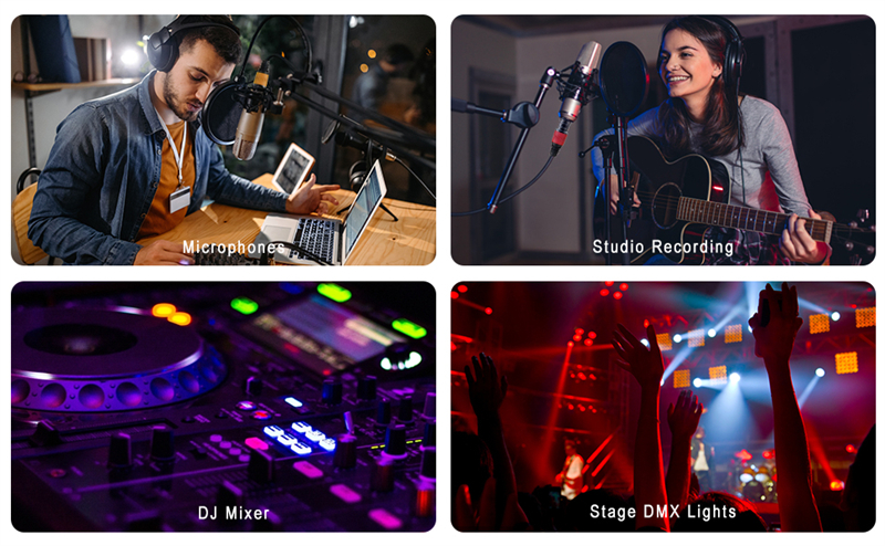 Product Detail:·Multi Color XLR Cables - Each cable has a different color connector, help you to track or match the right ends easily when use.Gold-Plated 3 Pin - This Aux Link microphone cables upgraded the 3 pin from silver-plated to gold-plated; Heavy duty metal connectors with Self-locking design help to ensure a higher quality of sound. Easy plugging and unplugging.·HI-FI Sound Quality - This xlr speaker cable use Oxygen-Free Copper (OFC), Polyethylene insulation, Copper braided shielding, these provide maximum cancellation of noise and hum, improve high frequency response. With soft & durable import PVC jacket, make this xlr to xlr cable more durable than normal mic cable and easy to clean.·Wonderful Compatibility - This Aux Link XLR male to female cable is wonderful compatible with 3 pin XLR connectors. Such as microphones, DMX stage lights, mixing consoles, cameras, audio, studio harmonizers, mixing boards, speaker systems and so on.